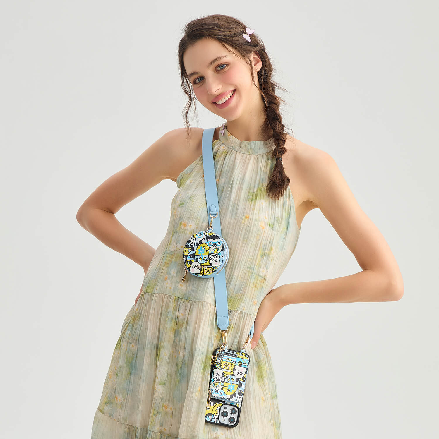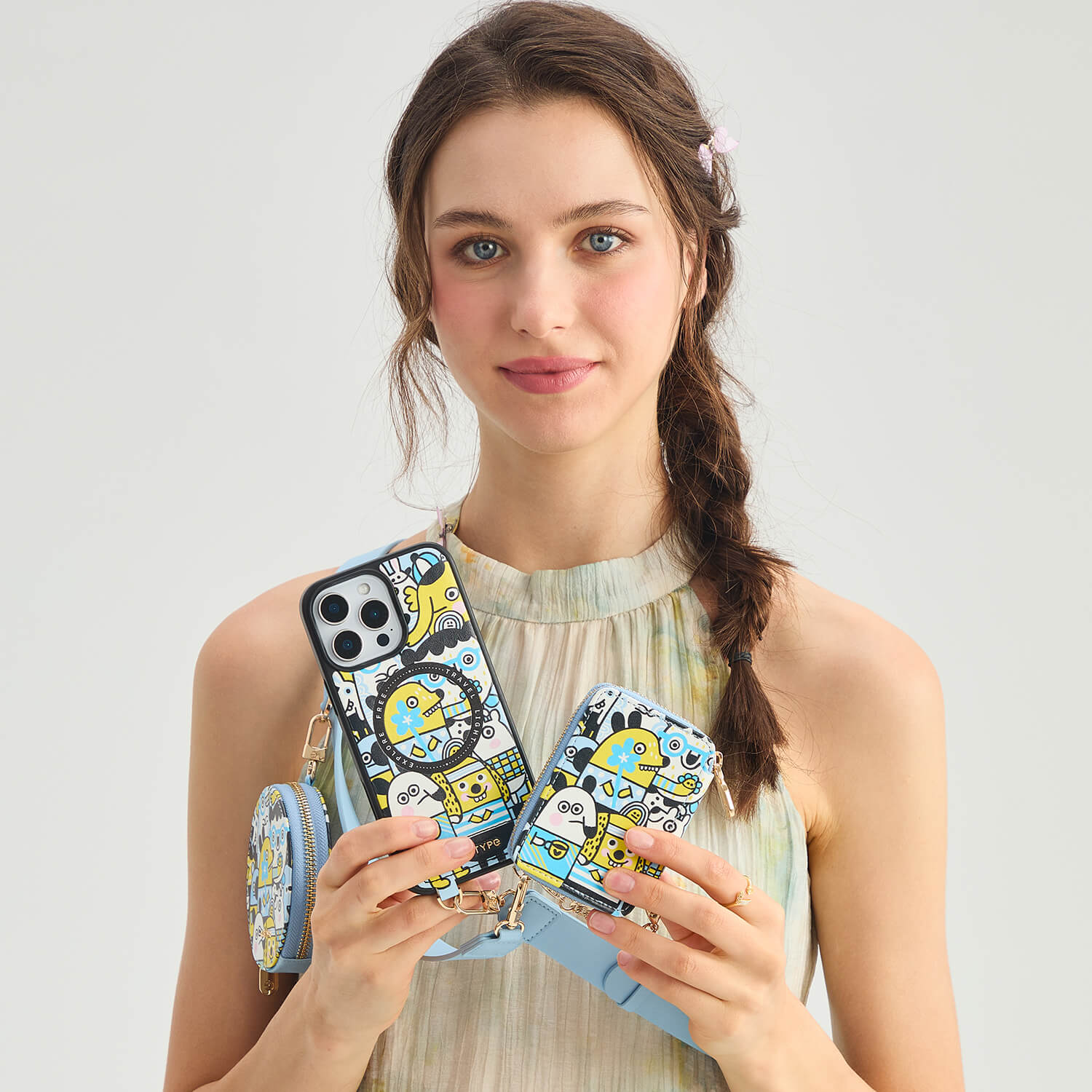 デザイナー、リンジー・ハンターによる個性的な作品は、当社のトラベルスマホケースと完璧にマッチします。取り外し可能なMagSafeウォレット、ワイヤレス充電ケース、ショルダーストラップを備えています。小さな必需品を収納できる丸型ポーチも付属。子供の頃のモチーフにインスパイアされた、キュートでノスタルジックなデザインを際立たせながら、スマートフォンとカードを安全に保護します。