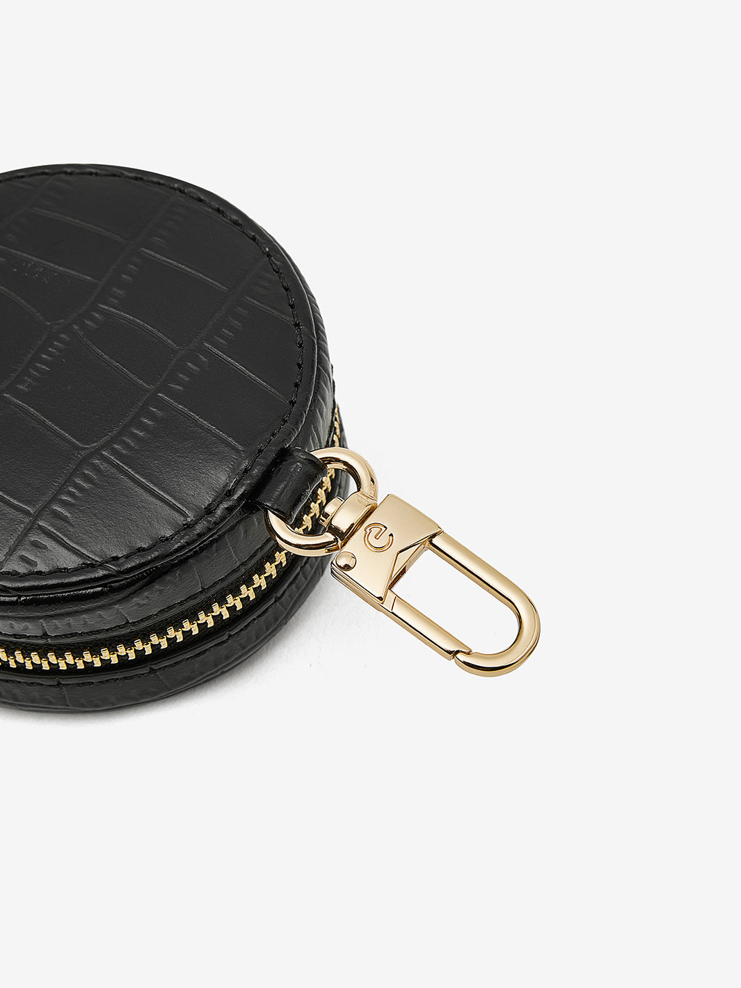 シックで多機能なクロコダイルラウンドポーチは、環境に優しいマイクロファイバーレザーとブランド独自の金属製Dバックルで作られており、取り付けが簡単で耐久性に優れた素材です。