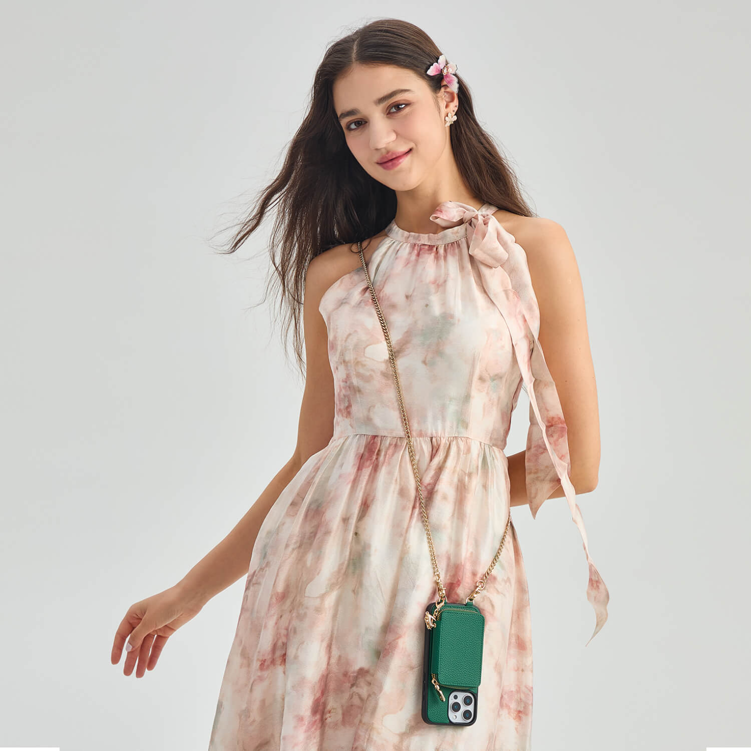 - ハンズフリーで便利なメタルクロスボディチェーン。