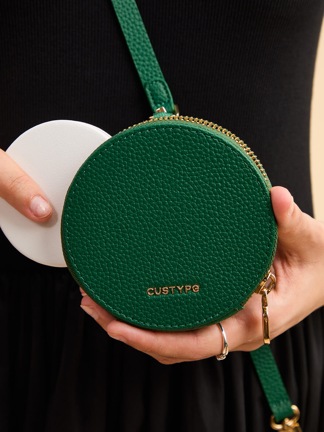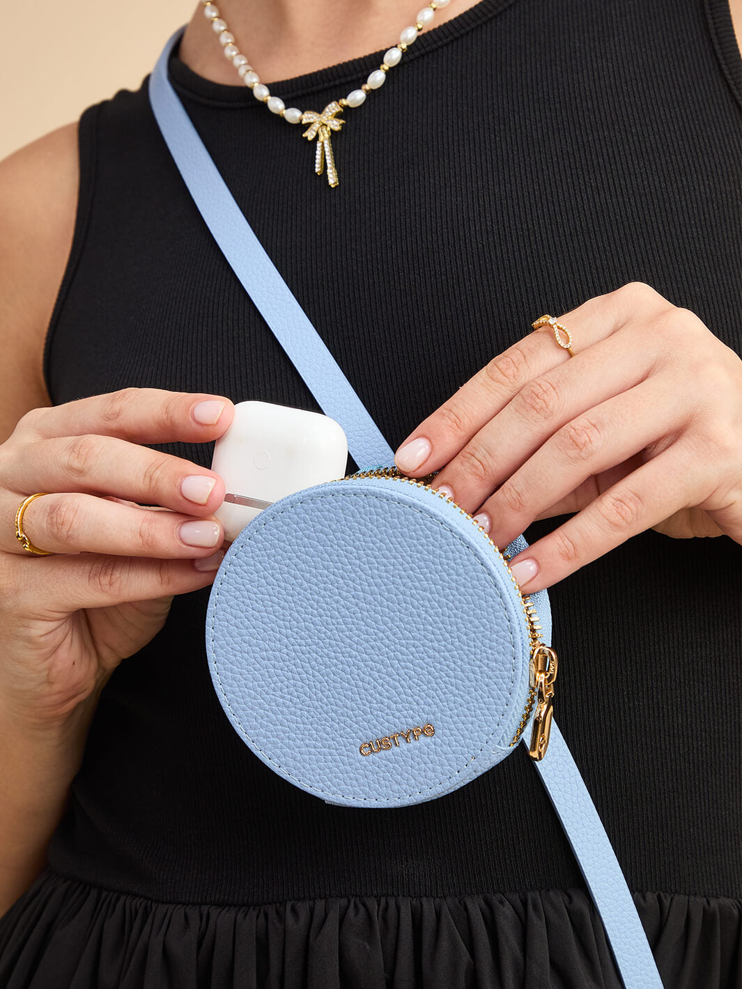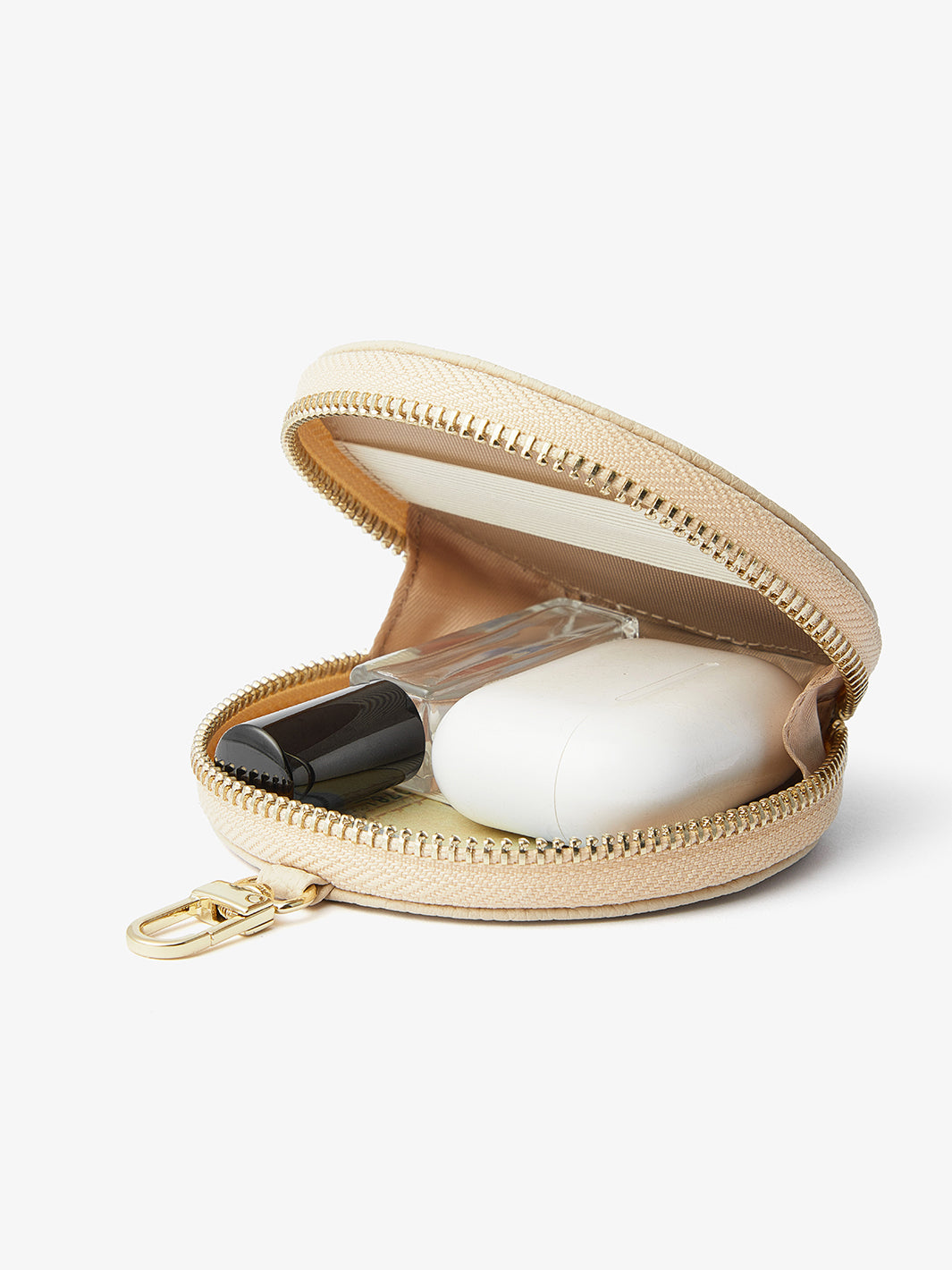 - ラウンドポーチは、AirPodsやリップスティック、パウダーなどの日用品を収納できます。