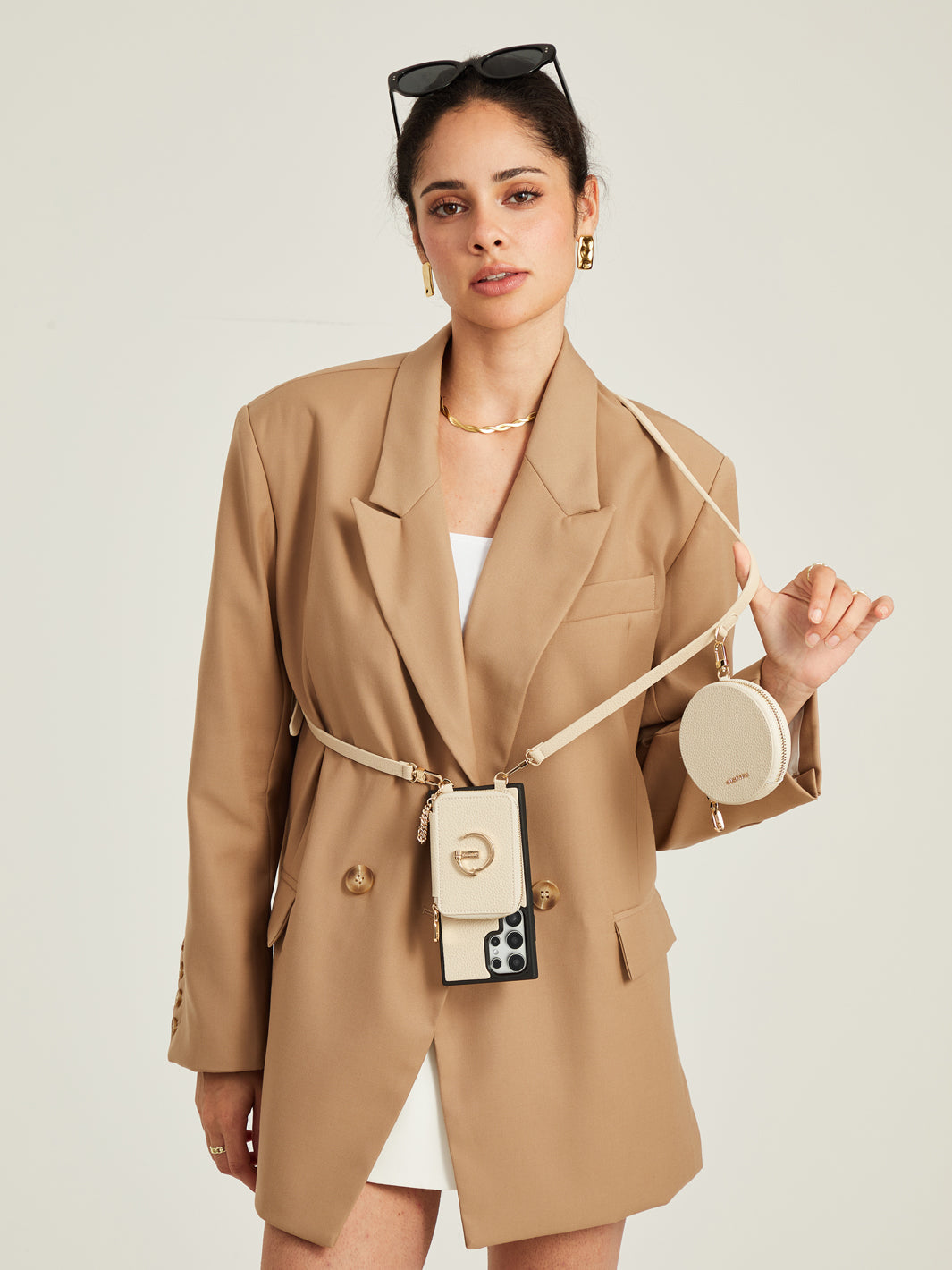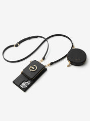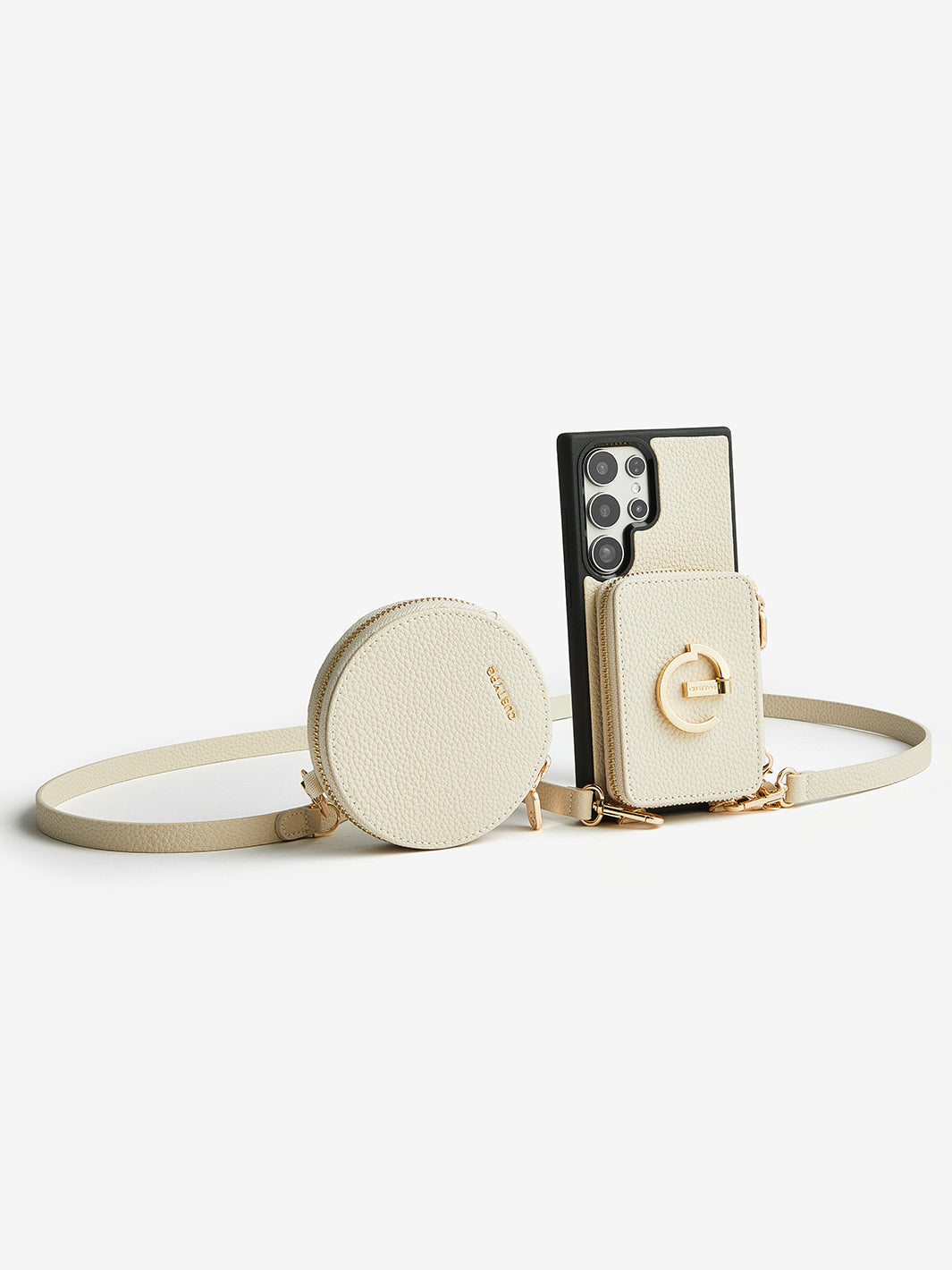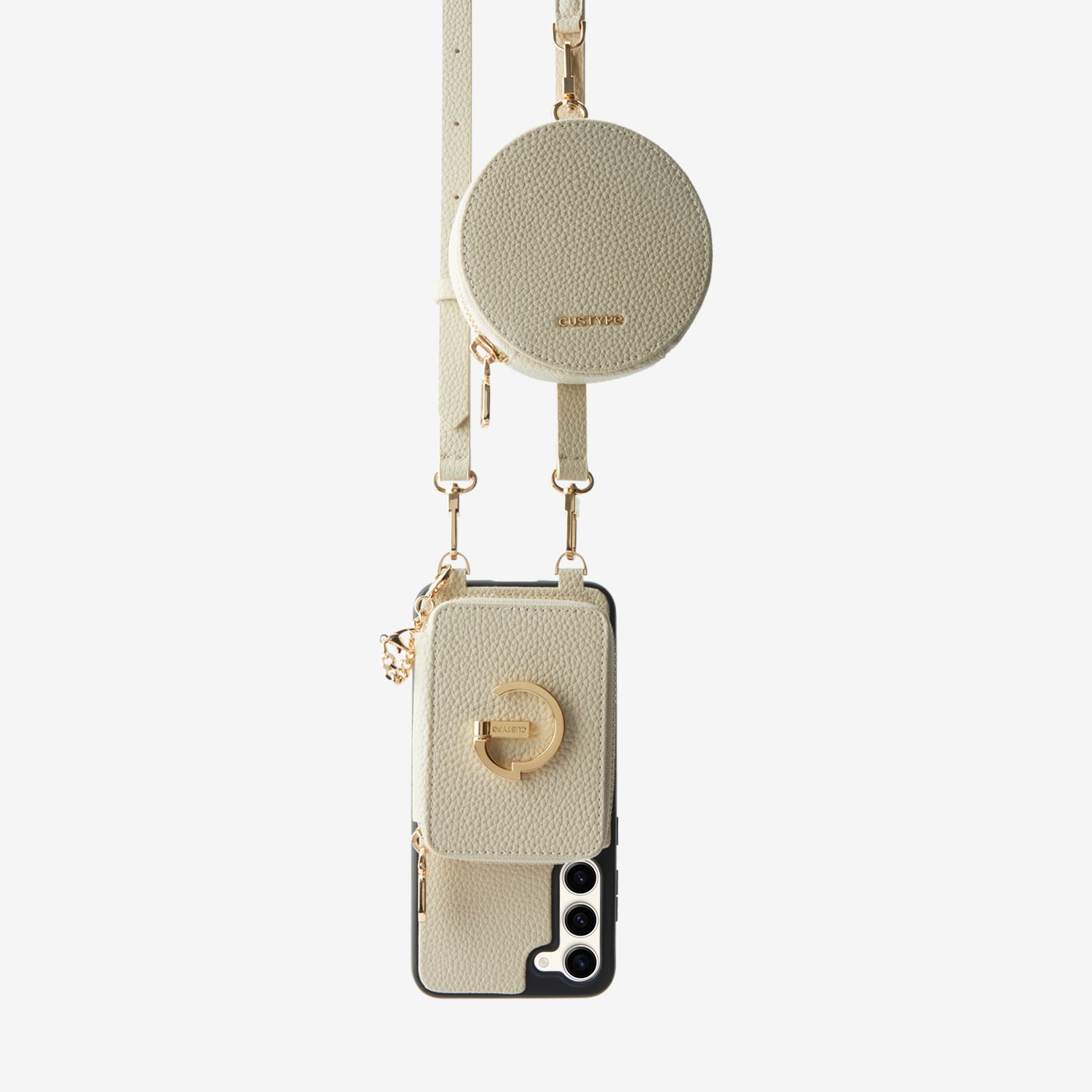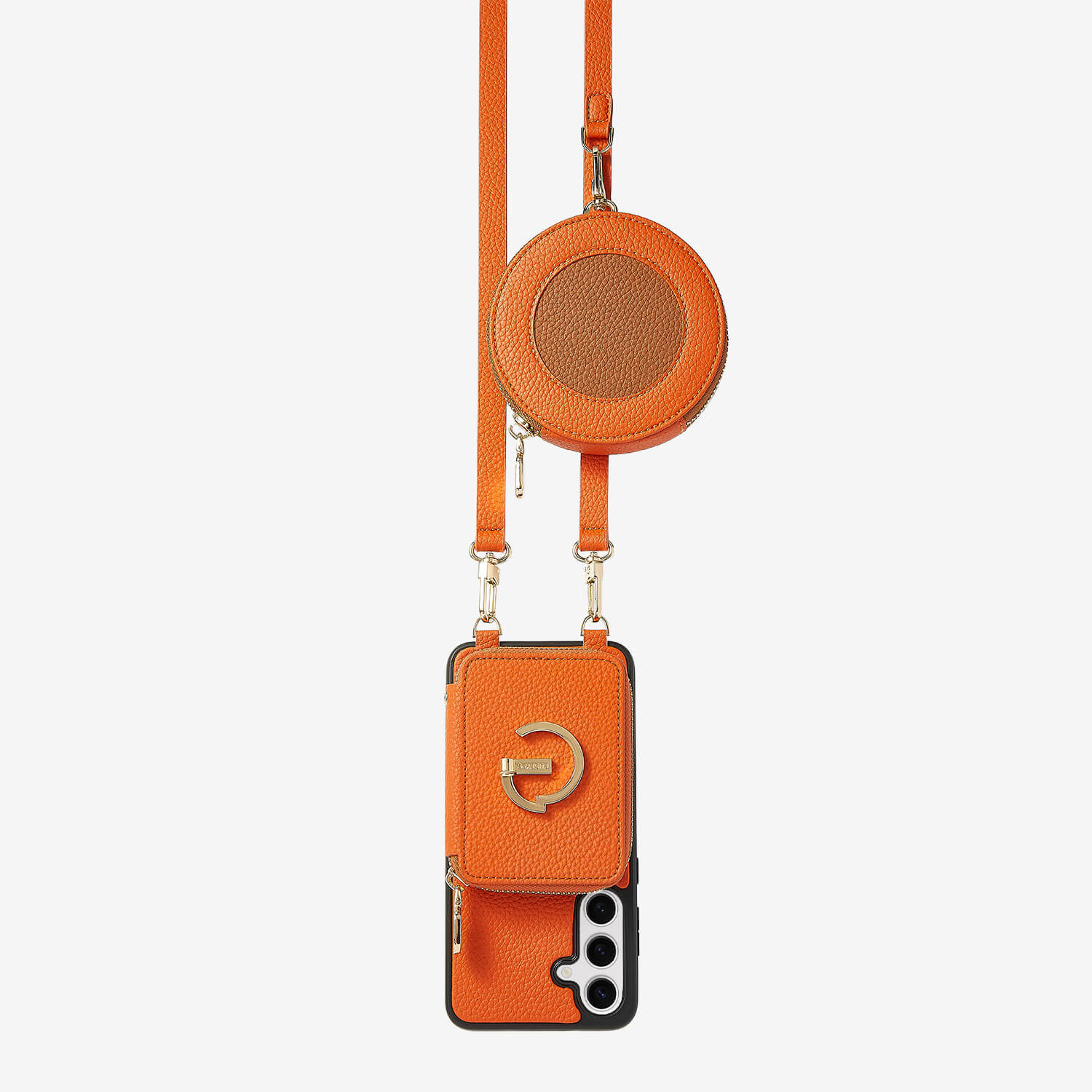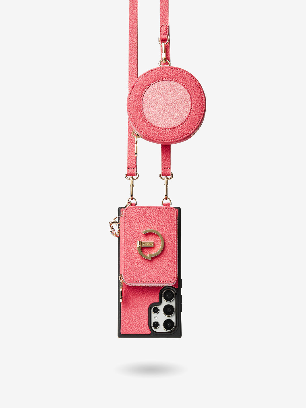- クロスボディストラップが付いたレザー製スマホケースで、ハンズフリーの便利さを提供。