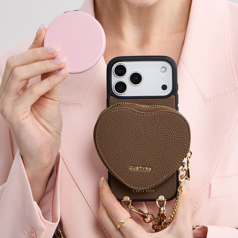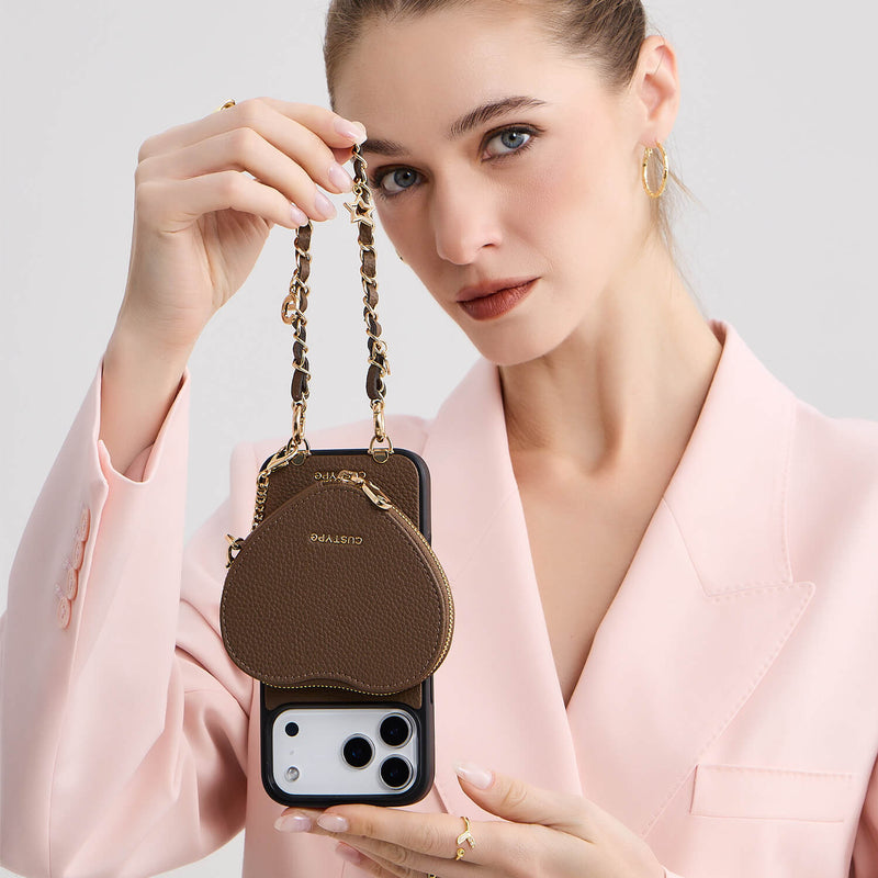 Our crossbody iphone 17 pro max case with a stylish heart pouch and chain. This chic design, crafted from premium vegan leather, is perfect for the iPhone 17 Pro Max. Featuring a Magsafe-compatible phone cover, heart pouch hold lipstick, 4-6 cards, and airpods, it’s the ultimate accessory to shop phone chain case convenience and fashion.