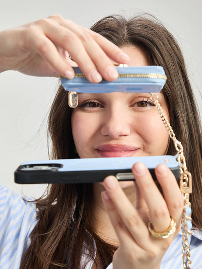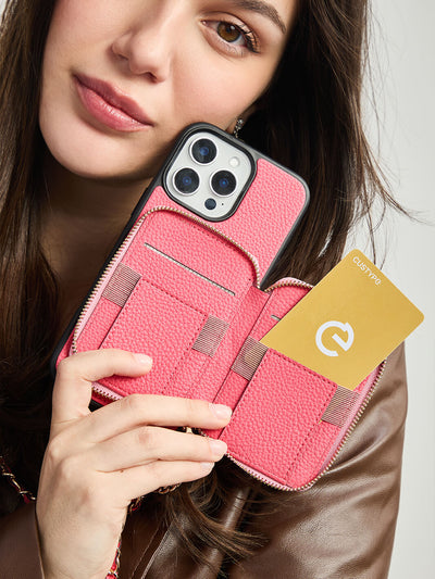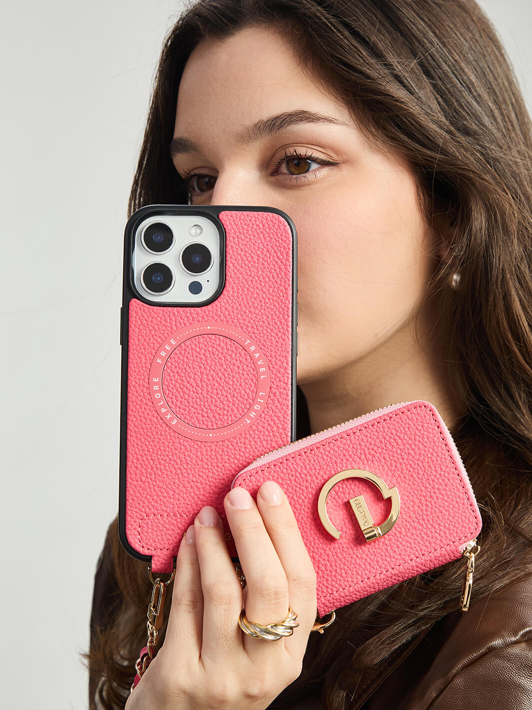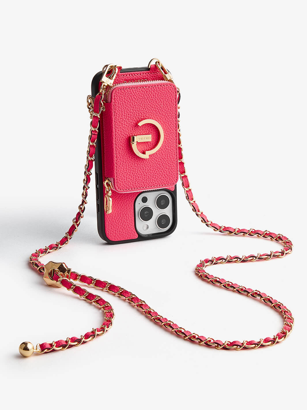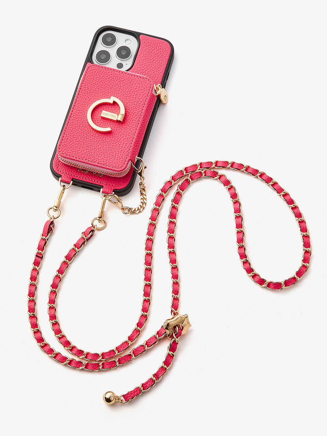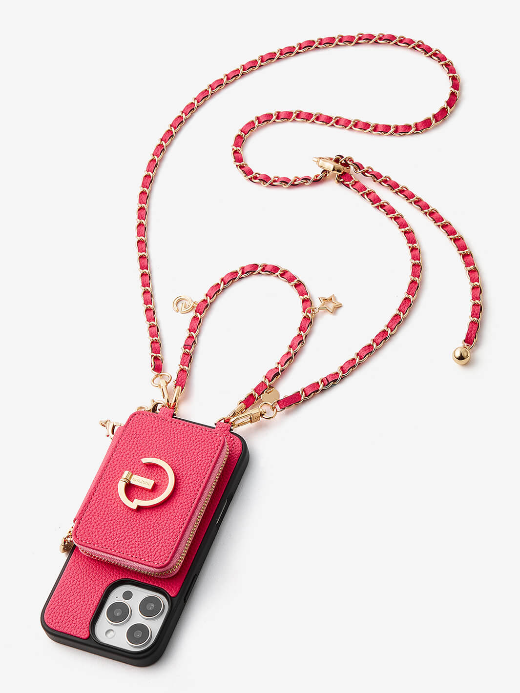 Adjustable crossbody phone case strap provides customizable length for comfortable hands-free use.