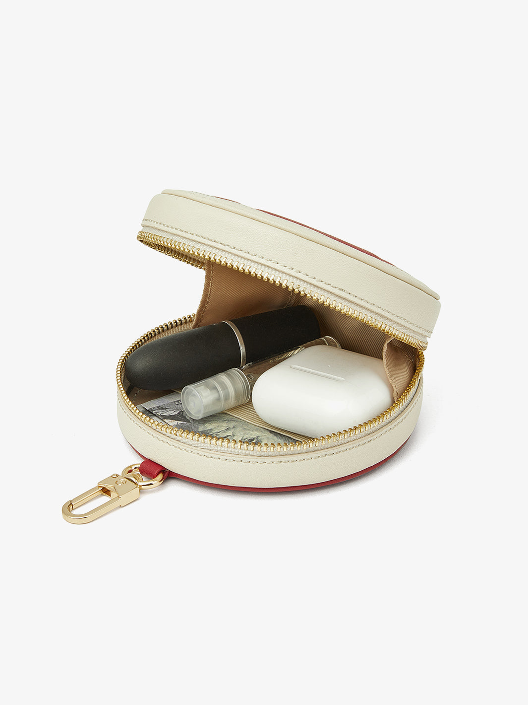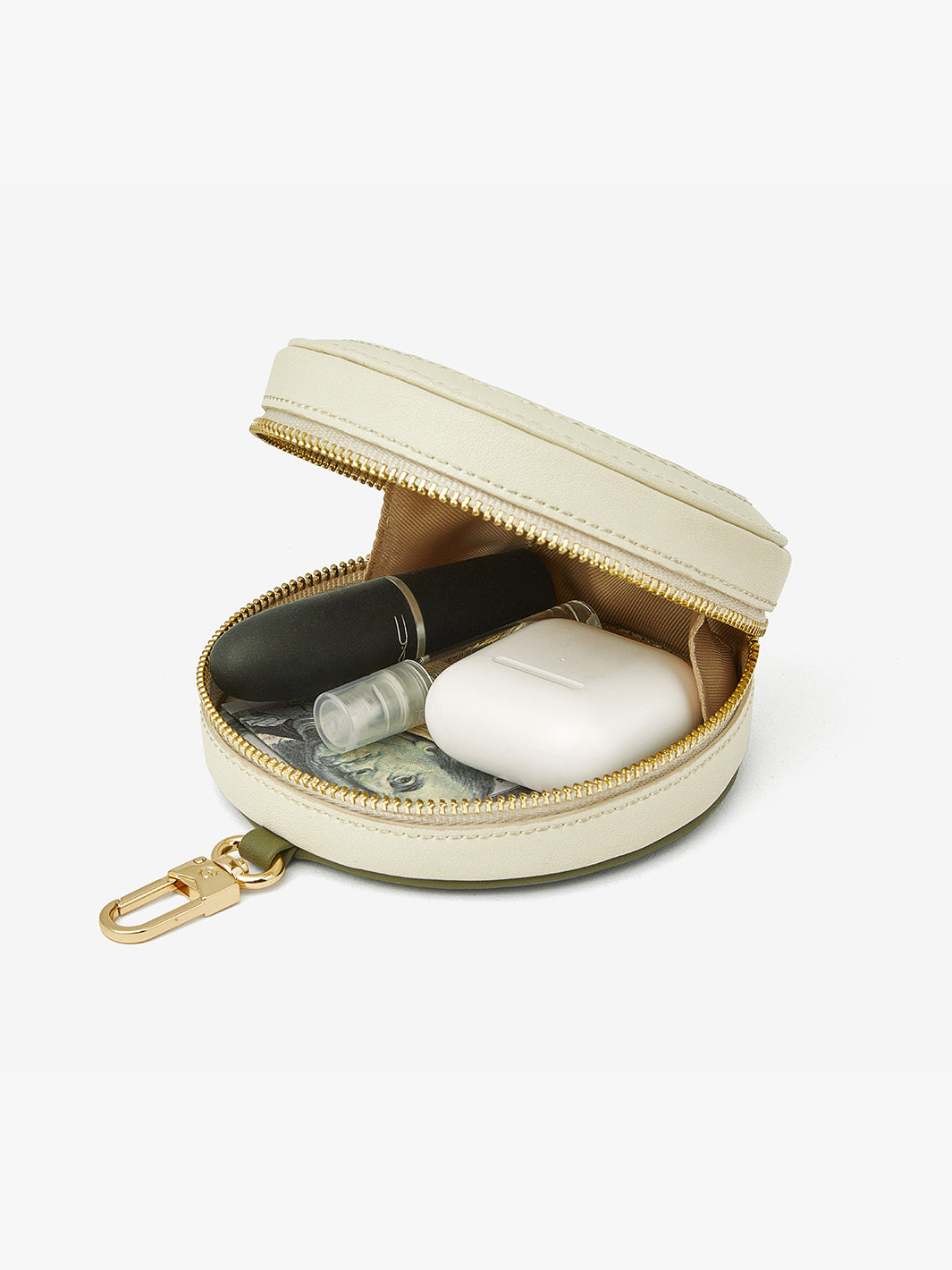 The smooth Splice Round Pouch is a chic and multifunctional round pouch, which provides a discrete way to carry your cash and cards while on the go. The Product adopted microfiber leather which is durable, absorbent, and soft non-real leather.